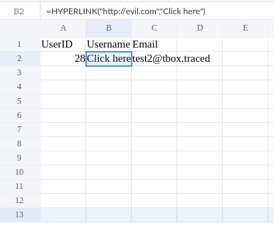 =HYPERLINK("http://evil.com", "Click here")